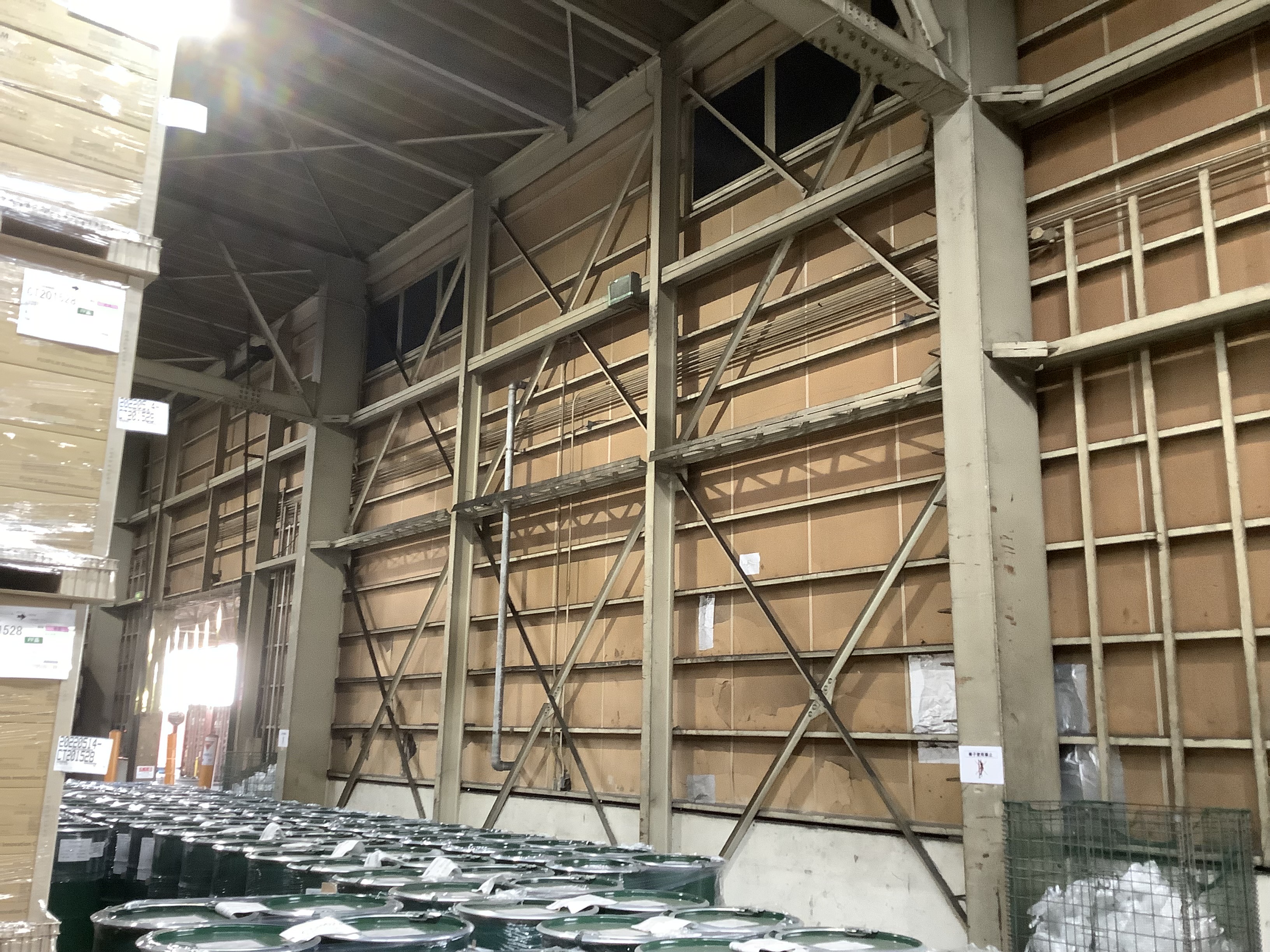 倉庫の耐震補強の為、補強部材の取り付けを行いました。