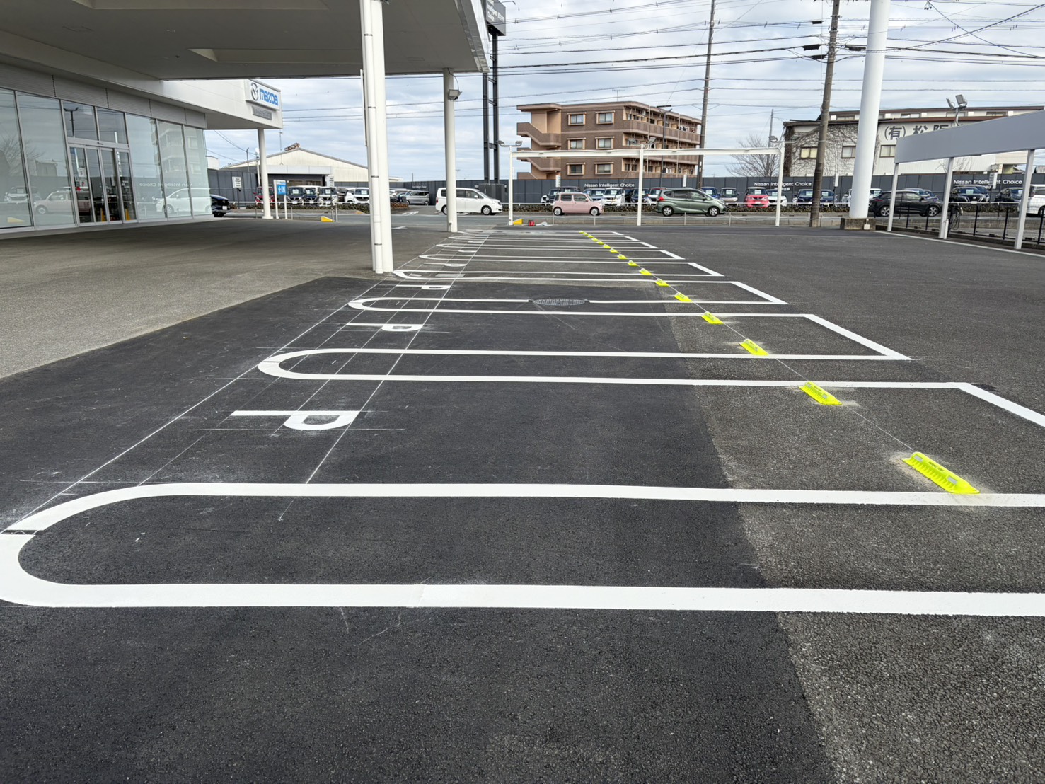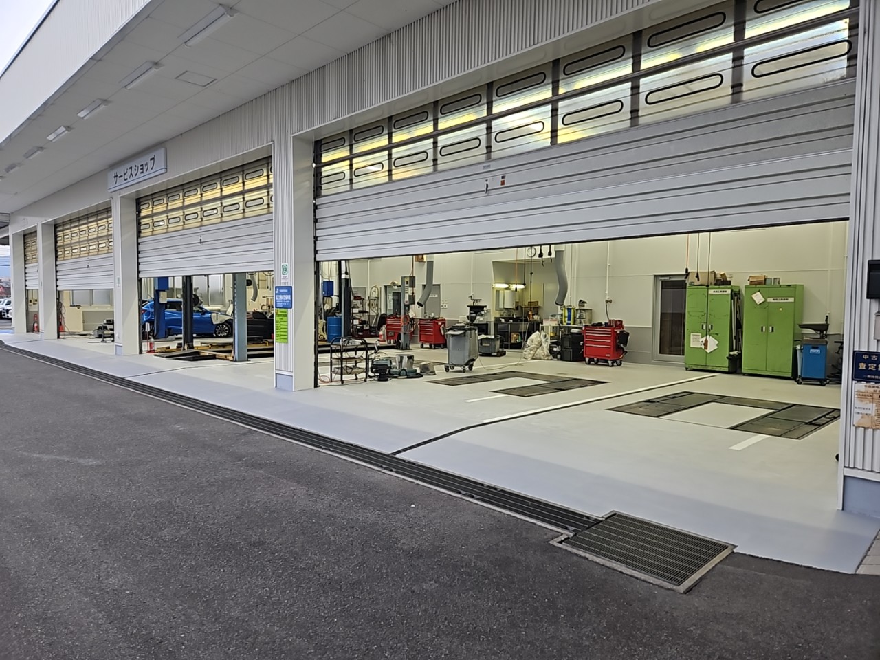 自動車ディーラーの整備工場の塗床・展示場アスファルトの打替え・看板の更新を行いました。